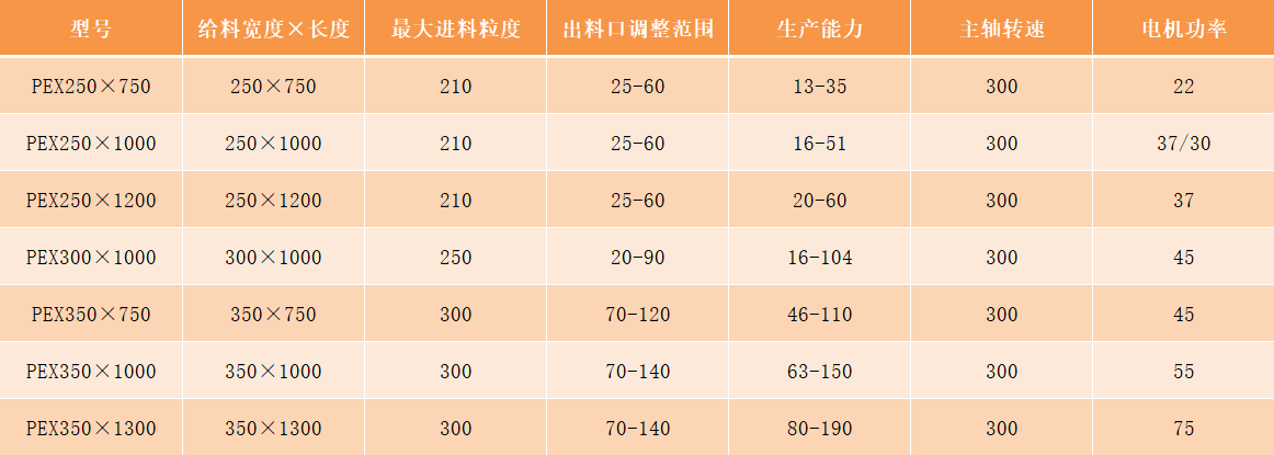 PEX系列細碎顎式破碎機型號及技術參數(shù):