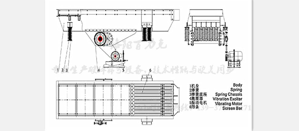 2、通常,在棒條振動給料機的排料端裝備有一個柵篩。通過它,分離出粒度小于各柵篩條 間距的物料,并將較大粒度的物料輸送到破碎機內。給料機被安裝固定在其基座上,且基座上配備有彈簧,以承載給料機的振動。